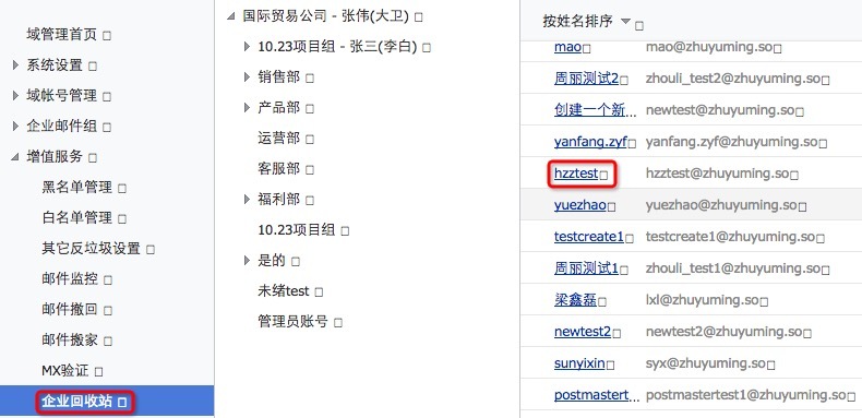 1.如误删除的邮件,请您先登录管理员邮箱,进入域管理 > 增值服务,打开企业回收站。