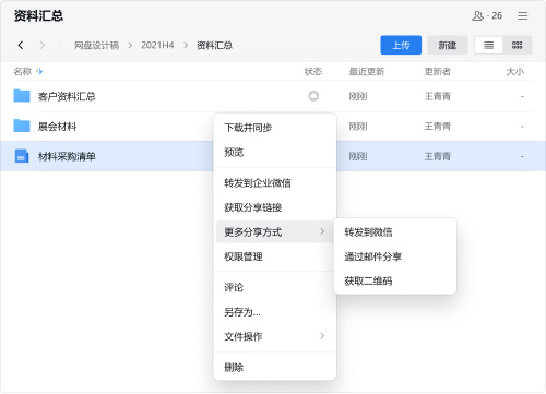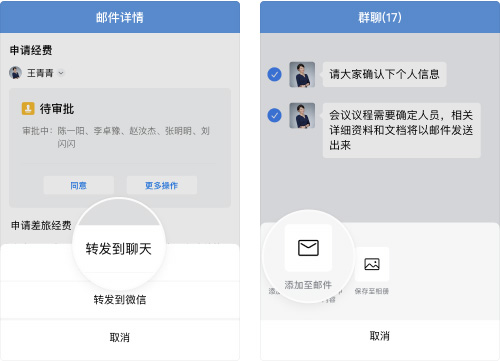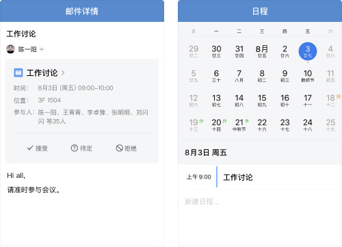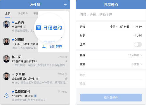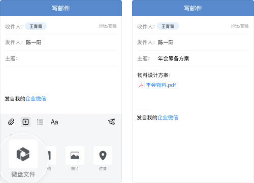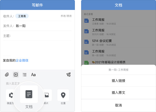 可在邮件中插入聊天记录、文档、微盘文件、日程等,也可将文档内容添加至邮件正文中,高效组织邮件内容。