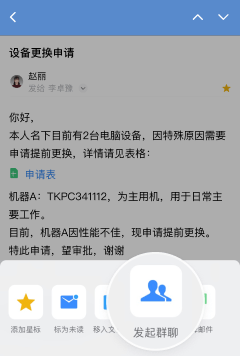 读邮件时,可以直接向邮件的收发件人一键拉起群聊,快速讨论邮件内容,沟通更方便