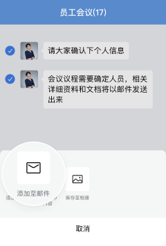 写邮件时,@企业内成员,将会同步添加至收件人并在收信时收到提示。还可以将聊天记录、文档等添加至邮件