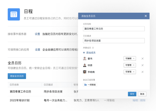 管理员可在管理后台创建全员日历,管理日历本可见范围