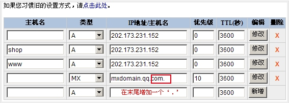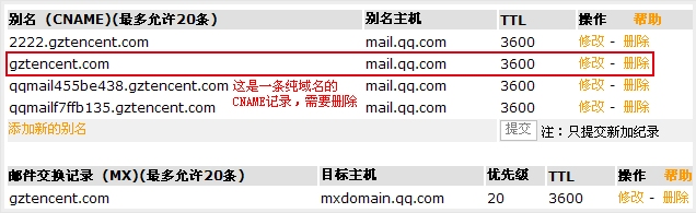 MX记录设置常见的几种异常情况,供参考: 1.为了保证收信的稳定,请您在设置域名MX记录的同时,删除其它的MX记录。 2.有些域名提供商的的域名设置中,如果之前存在纯域名的CNAME记录,则可能会导致MX记录无法生效。以新网为例,如图所示: 域名gztencent.com的设置情况如下: 3.有些域名提供商的域名MX设置默认会加上域名本身为后缀,此时需要在后面加上一个’.’,以35互联为例,如图所示: 4.MX记录生效通常需要2-24个小时,首先请确认您的MX记录设置后等待了足够长的时间。 相关问题: |
