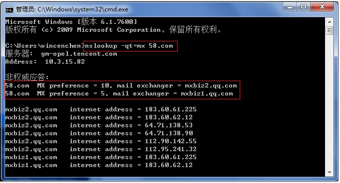 腾讯企业邮箱要求设置的MX记录有两条,分别是:mxbiz1.qq.com (优先级5)mxbiz2.qq.com (优先级10)如图,查域名 58.com 的mx记录。