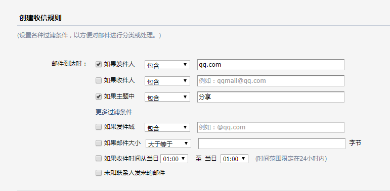 收信规则是一种可以由用户设定条件,根据不同条件实现自动处理邮件的功能。 您可以按照以下步骤设置: 登录腾讯企业邮箱; 点击上方“设置”标签; 在邮箱设置页面点击“收信规则”标签,然后点击“创建收信规则”进入过滤条件设置页面; 在规则过滤条件设置页面根据自己的要求择相应的条件,并在所选条件的对话框内填入相应的关键字、关键词,然后在标题“当邮件到达时”所在行选择“启用本规则”或“不启用本规则”,最后点击“保存”按钮。 保存设置以后,在收邮件时,规则过滤条件就会按照设置好的规则,执行移到个人文件夹、短信通知、直接删除、自动回复等功能。如果需要修改过滤器内容,只要选择需要修改收信规则并打开,修改完后保存即可。 单条收信规则可以设置多个条件对邮件进行组合过滤,同时满足所有勾选条件的邮件将命中该条规则,执行指定的操作。