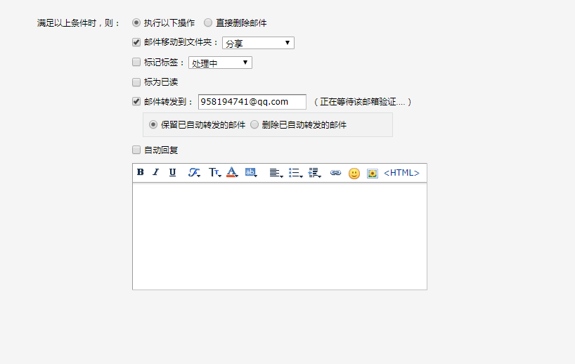同一目标邮件的多条规则请合并在一条规则的复合操作中,否则只能执行较新的一条规则。 用户建立收信规则时,请细心检查是否与之前的规则存在冲突。