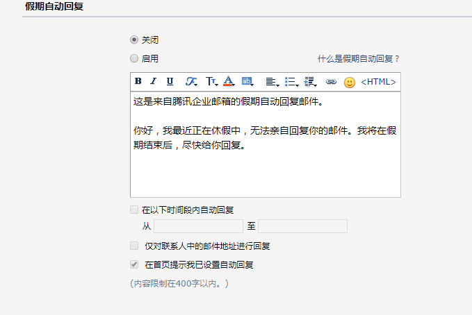 当您出差、旅游或一段时间不方便上网时,可以启用假期自动回复,它帮您自动回复。注:为避免发件方重复收到自动回复邮件,同一天只会收到收件方一封自动回复的邮件。
