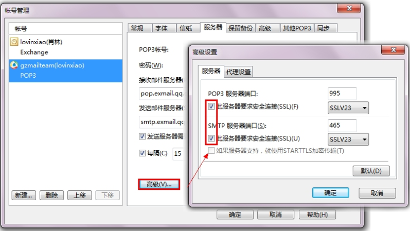 如果您的电子邮件客户端支持SSL,可以在设置中选择使用SSL。 通用配置参数: (我们已经默认都支持这些协议,用户无需自己手动开启这些服务器与端口) POP3/SMTP协议 接收邮件服务器:pop.exmail.qq.com ,使用SSL,端口号995 发送邮件服务器:smtp.exmail.qq.com ,使用SSL,端口号465 海外用户可使用以下服务器 接收邮件服务器:hwpop.exmail.qq.com ,使用SSL,端口号995 发送邮件服务器:hwsmtp.exmail.qq.com ,使用SSL,端口号465 IMAP协议 接收邮件服务器:imap.exmail.qq.com ,使用SSL,端口号993 发送邮件服务器:smtp.exmail.qq.com ,使用SSL,端口号465 海外用户可使用以下服务器 接收邮件服务器:hwimap.exmail.qq.com ,使用SSL,端口号993 发送邮件服务器:hwsmtp.exmail.qq.com ,使用SSL,端口号465 账户名:您的企业邮箱账户名,账户名需要填写完整的邮件地址 密码:您的企业邮箱密码(如已开启安全登陆需要使用客户端专用密码,成员如何绑定/关联微信以及开启安全登录获取客户端专用密码?) 电子邮件地址:您的企业邮箱的完整邮件地址 使用SSL协议之前,请您先参考常用客户端的一般配置方式。 在Foxmail中使用SSL: 1.如果你之前未进行过配置,则可参考Foxmail客户端的设置,帮助中将会引导你在第一次创建时如何设置SSL方式。 2.本帮助主要引导用户如何在已经配置好的账号中启用SSL加密方式。(Foxmail7.0以上版本)