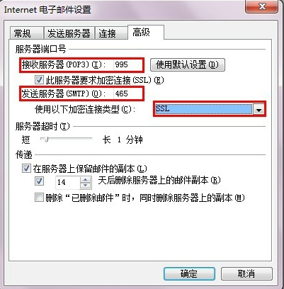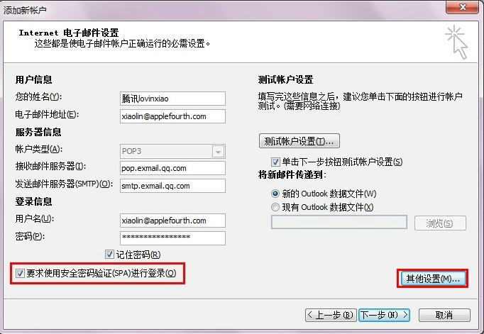 在Foxmail中修改IMAP账户也是同样的操作。 在Outlook 中使用SSL: 设置之前请参考:Outlook客户端设置 如果需要使用SSL加密方式,则在创建或者修改账户设置时设置好SSL的相关参数即可。 POP协议 如图,勾选[要求使用安全密码验证进行登录],并在[其他设置]中[高级]选项卡中勾选相关SSL选项与填写SSL端口号。