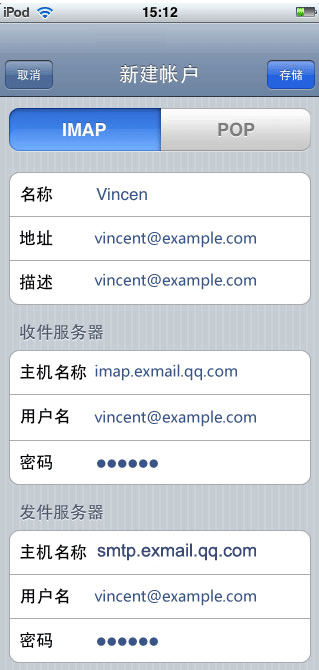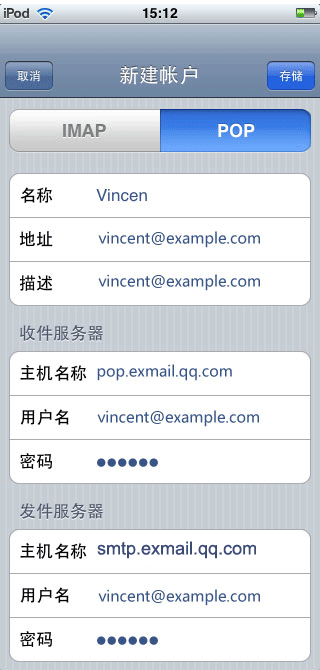 默认情况下,iPhone/iPod touch会以POP协议进行收取邮件。POP方式的设置如下所示: