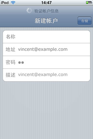 小技巧:点击存储后,iPhone会自动将相关设置补充完整,如果您想手动进行配置(例如换用IMAP协议,或者修改服务器地址),可故意输入一个错误的密码,验证密码失败后就进入了手动设置页面。
