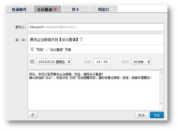 腾讯企业邮箱支持“会议”邮件,您可以在邮箱发起会议邀请,或接受会议邀请。