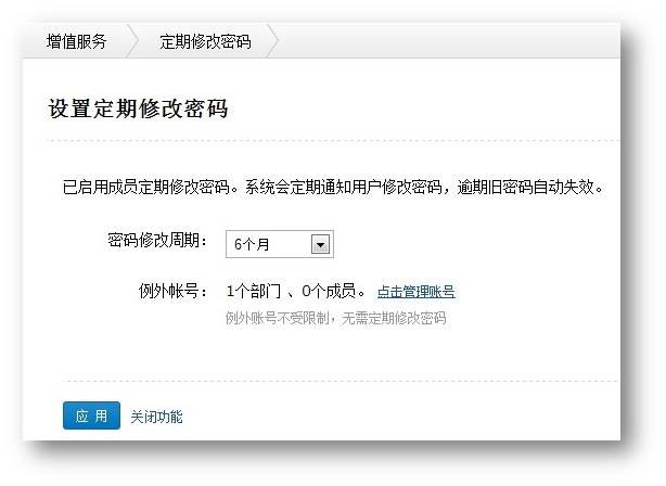 管理员还可以设置“例外帐号”,例外帐号不受限制,无需定期修改密码。