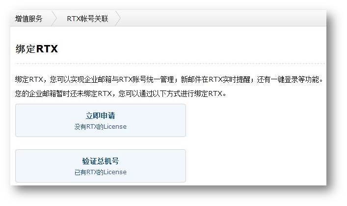管理员可以登录管理页面申请绑定新的RTX总机号,或绑定已有RTX总机号。