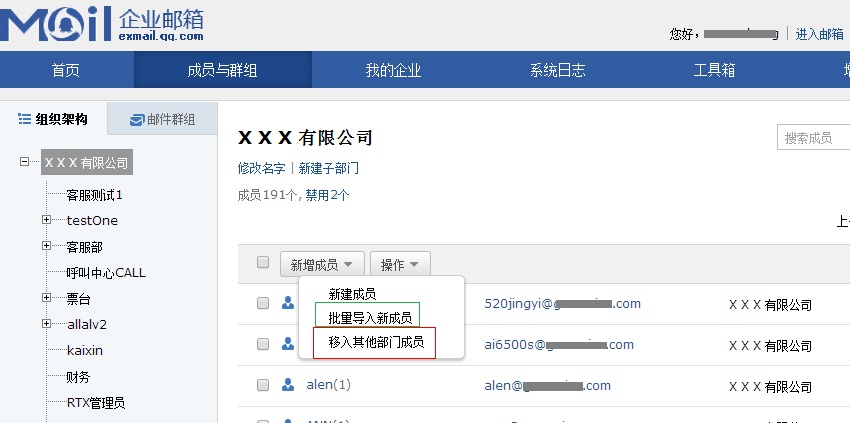 登入管理员界面》成员与群组》选中要添加成员的部门》新增成员》移入其他部门成员