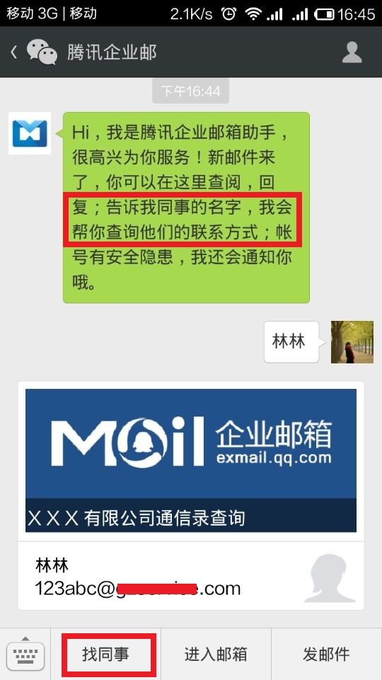 绑定微信,发送同事的姓名至企业邮箱助手,或者点击“找同事”按钮,我们就可以立刻帮你查找他/她的联系方式,点击电话号码可直接呼叫对方,或点击邮箱地址直接发送邮件。