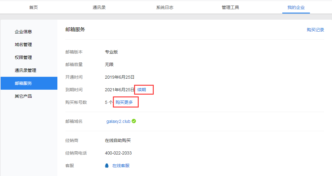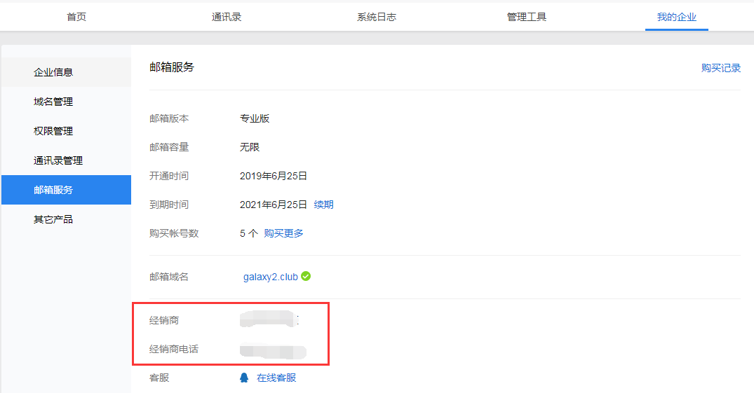 2. 预约登记购买的用户如需要续费或是扩容,需要联系您的经销商进行续费或是扩容。请登录管理员邮箱帐号后,进入“我的企业-邮箱服务”查看经销商名称和联系方式