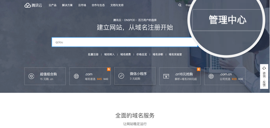 第一步:登录腾讯云/DNSPOD,点击进入【管理中心】