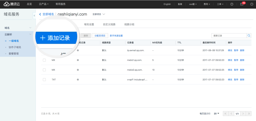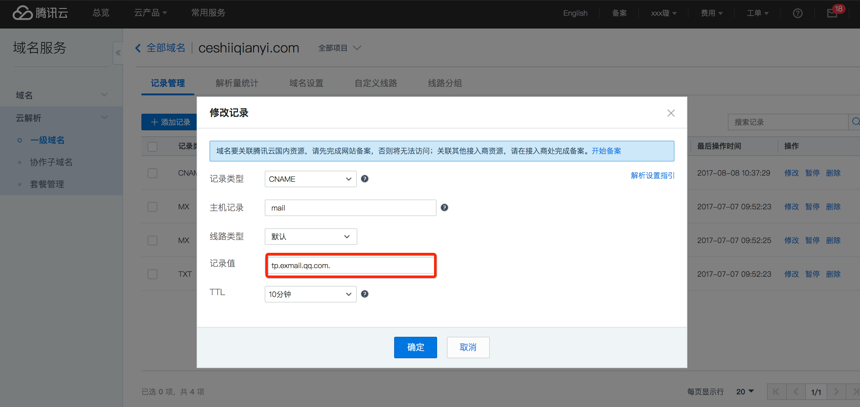 若原来设置记录值为exmail.qq.com,请修改为tp.exmail.qq.com;请仅添加一条Cname类型解析记录即可。