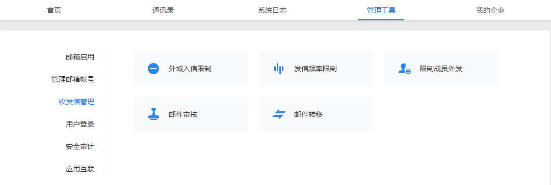 1.在管理员后台找到【管理工具】-【收发信管理】-【限制成员外发】功能入口:
