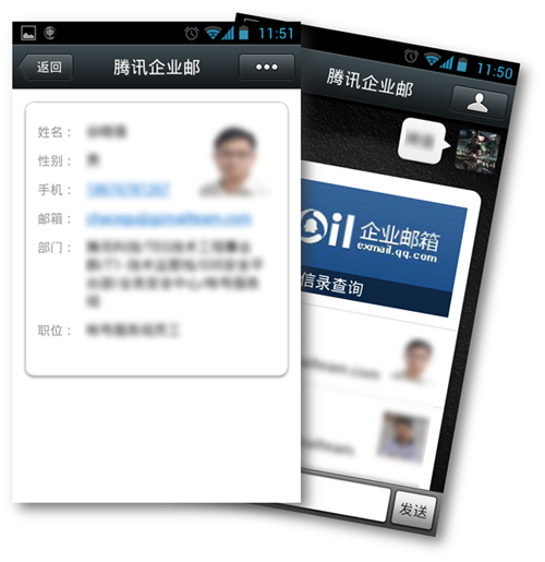 发送同事的姓名至企业邮箱助手,我们立刻帮你查找他/她的联系方式,点击电话号码可直接呼叫对方,或点击邮箱地址直接发送邮件。