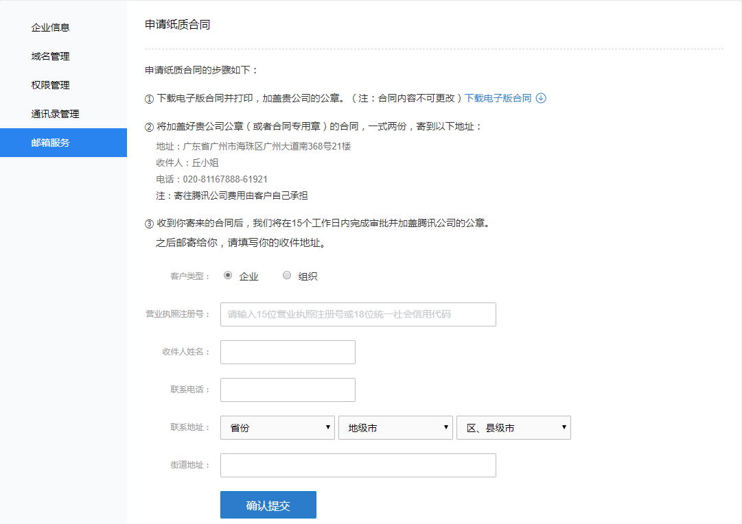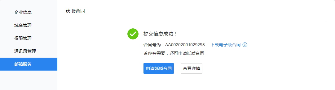 ① 首先生成电子合同。在我的企业-邮箱服务-购买记录,点击“索取合同”,生成一个电子版合同。