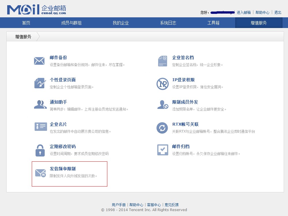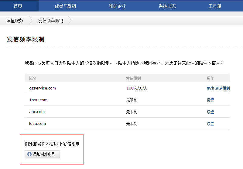登录腾讯企业邮箱“管理员”页面,“增值服务”-》“发信频率限制”