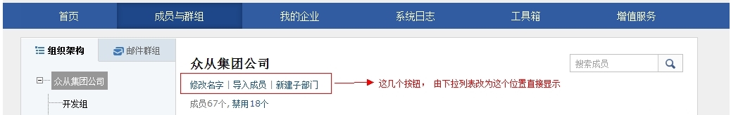 (a)‘新建部门’、‘修改部门名称’、‘删除部门’、‘导入成员’这4个按钮的位置,由原来隐藏在下拉列表,改为直接在页面上显示,方便用户找到操作入口。