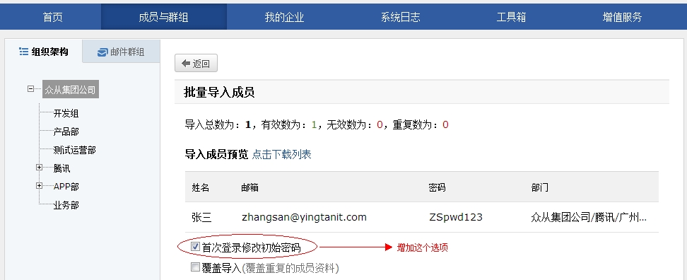 (b) 导入成员时, 增加了‘首次登陆修改密码’的选项,用户可以选择是否启用该选项。 在导入成员是同一密码的情况下,建议勾选需要启用。