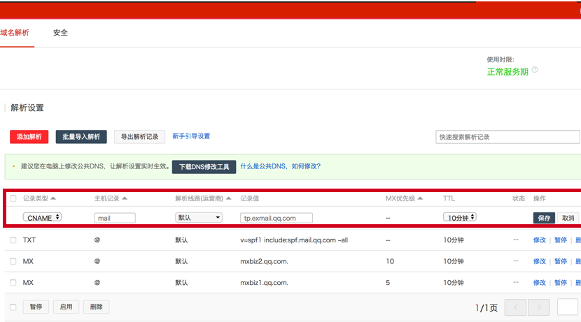 若原来设置记录值为exmail.qq.com,请修改为tp.exmail.qq.com;请仅添加一条Cname类型解析记录即可。