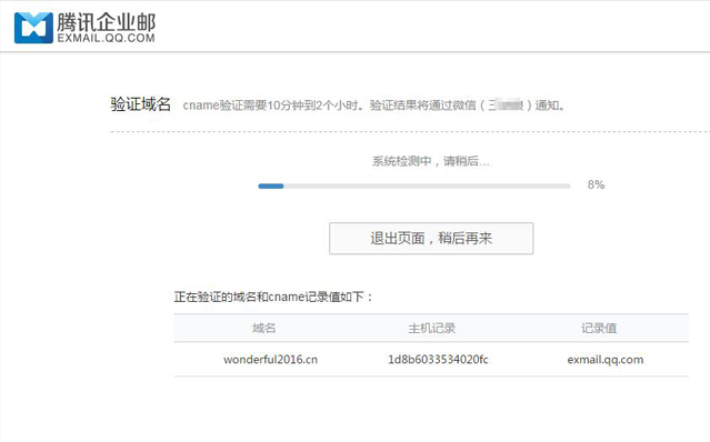 Cname验证结果我们会通过您扫码验证时使用的微信通知您