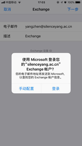 2.弹框提示“使用Microsoft 登录您的Exchange账户?”时,选择“手动配置”,然后输入电子邮件和密码(注意:如果邮箱已开启安全登录,请输入客户端专用密码)后,点击“下一步”