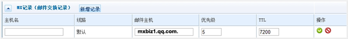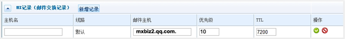 3、设置如下的MX记录:邮件主机 mxbiz1.qq.com. ,优先级为5 。邮件主机 mxbiz2.qq.com. ,优先级为10 。