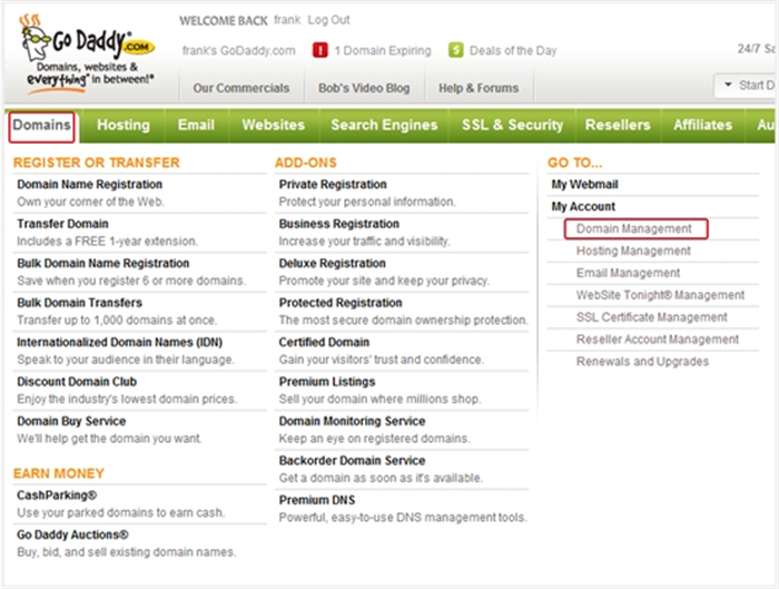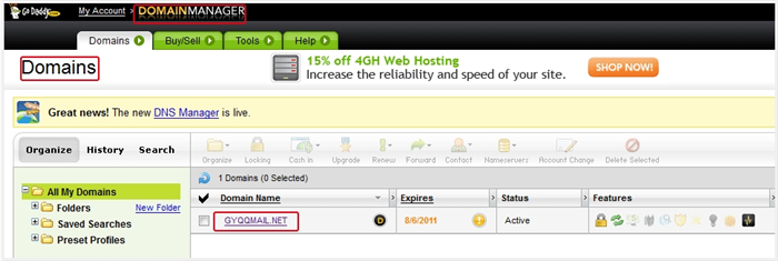1、登录后,打开“Domains”标签,点击“Domain Management”