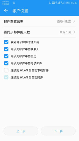 3.设置自动接收邮件的频率、同步邮件的天数以及选择需要同步的项目,包括日历、电子邮件、联系人等,然后点击“下一步”