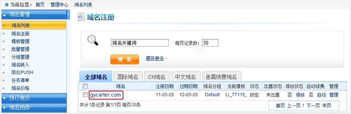 2、进入管理中心-》域名列表,点击需要解析的域名: