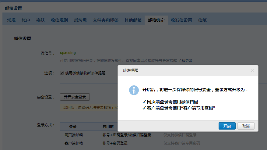 开启后,将进一步保障你的帐号安全,登录方式升级为:网页端登录需使用微信扫码;客户端登录需使用“客户端专用密码”, 更有效保障你的邮箱安全。