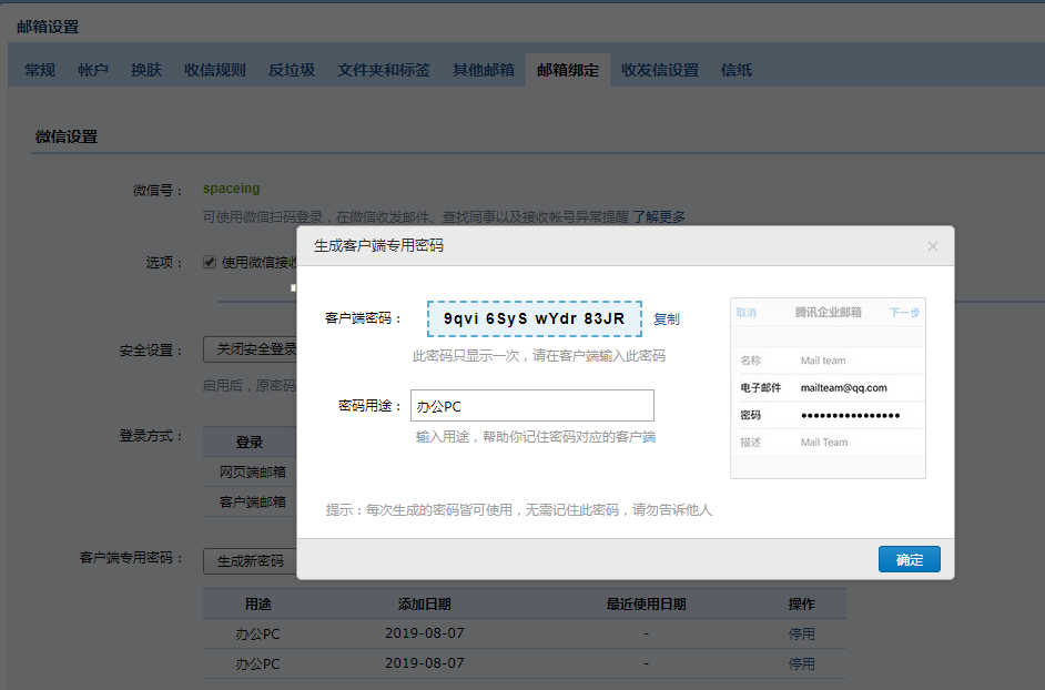 5.生成密码后,在客户端端登录的时候在密码看输入该“客户端专用密码”,下面以Foxmail为例: