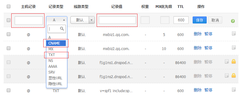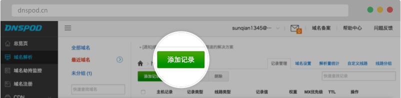 ② 进入添加记录页面,点击【添加记录】,记录类型选择cname类型和TXT类型,然后复制主机记录、记录值后粘贴到对应表格。其它保持默认。