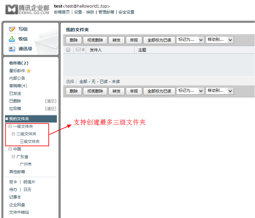 描述:腾讯企业邮箱网页版支持多级文件夹功能,支持创建最多三级文件夹