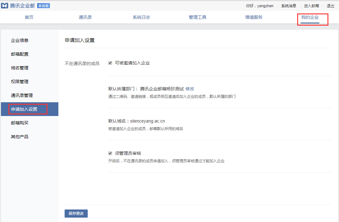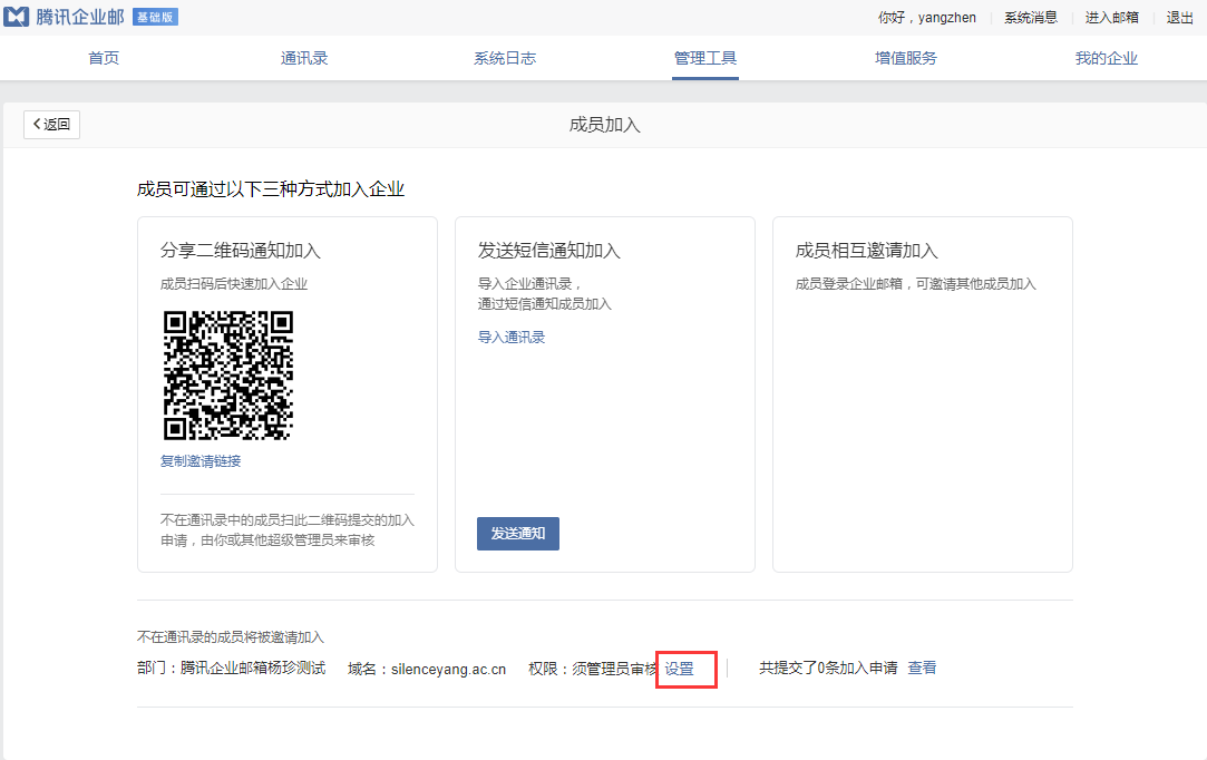 此外,可以设置加入申请是否须管理员审核, 以及被邀请加入的成员默认所属部门、所使用的邮箱域名。
