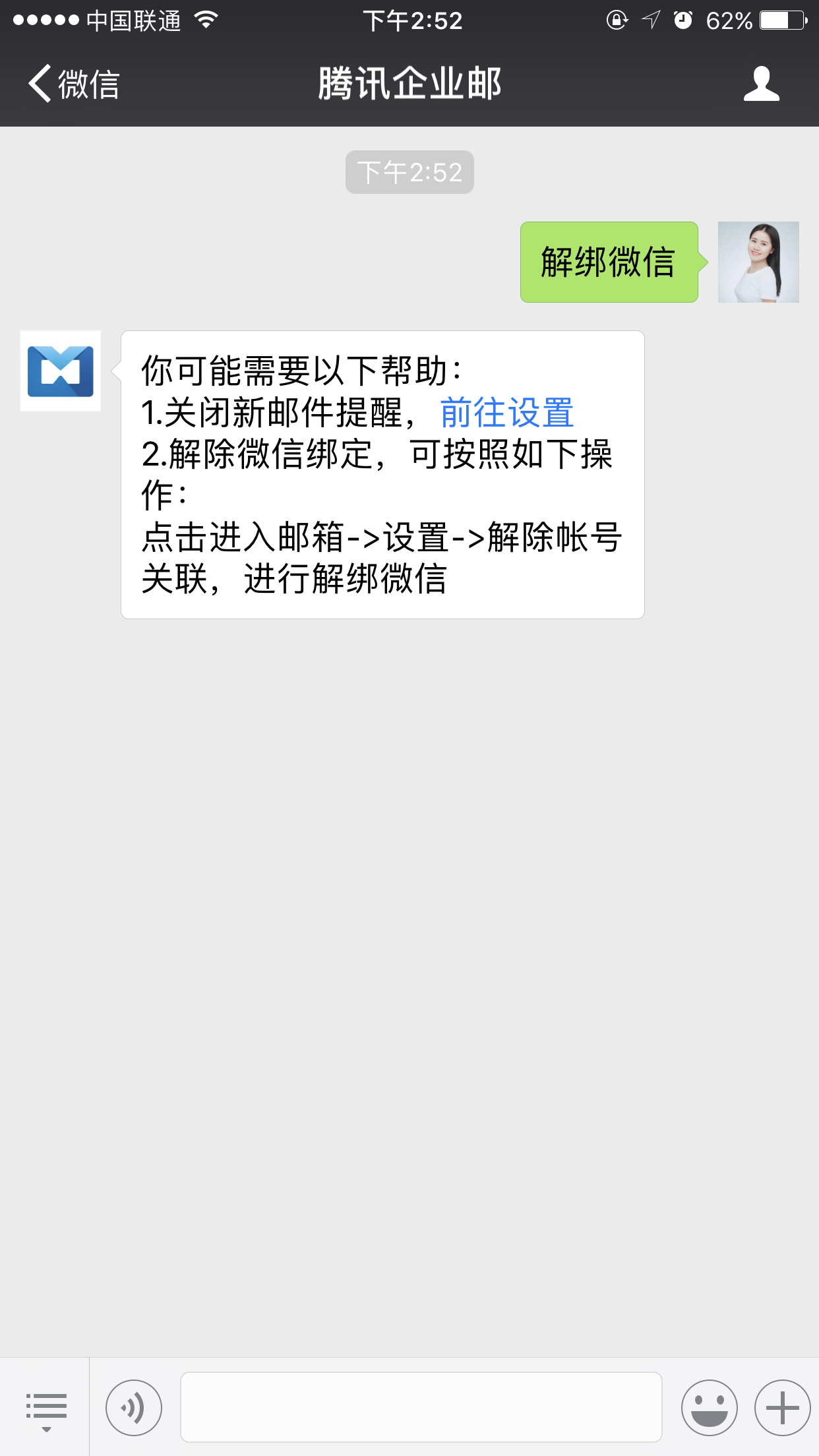 1.对已绑定微信的邮箱帐号,在公众号中回复“解绑微信”或“解绑”或“解除绑定”的关键词后,系统提示如下图: