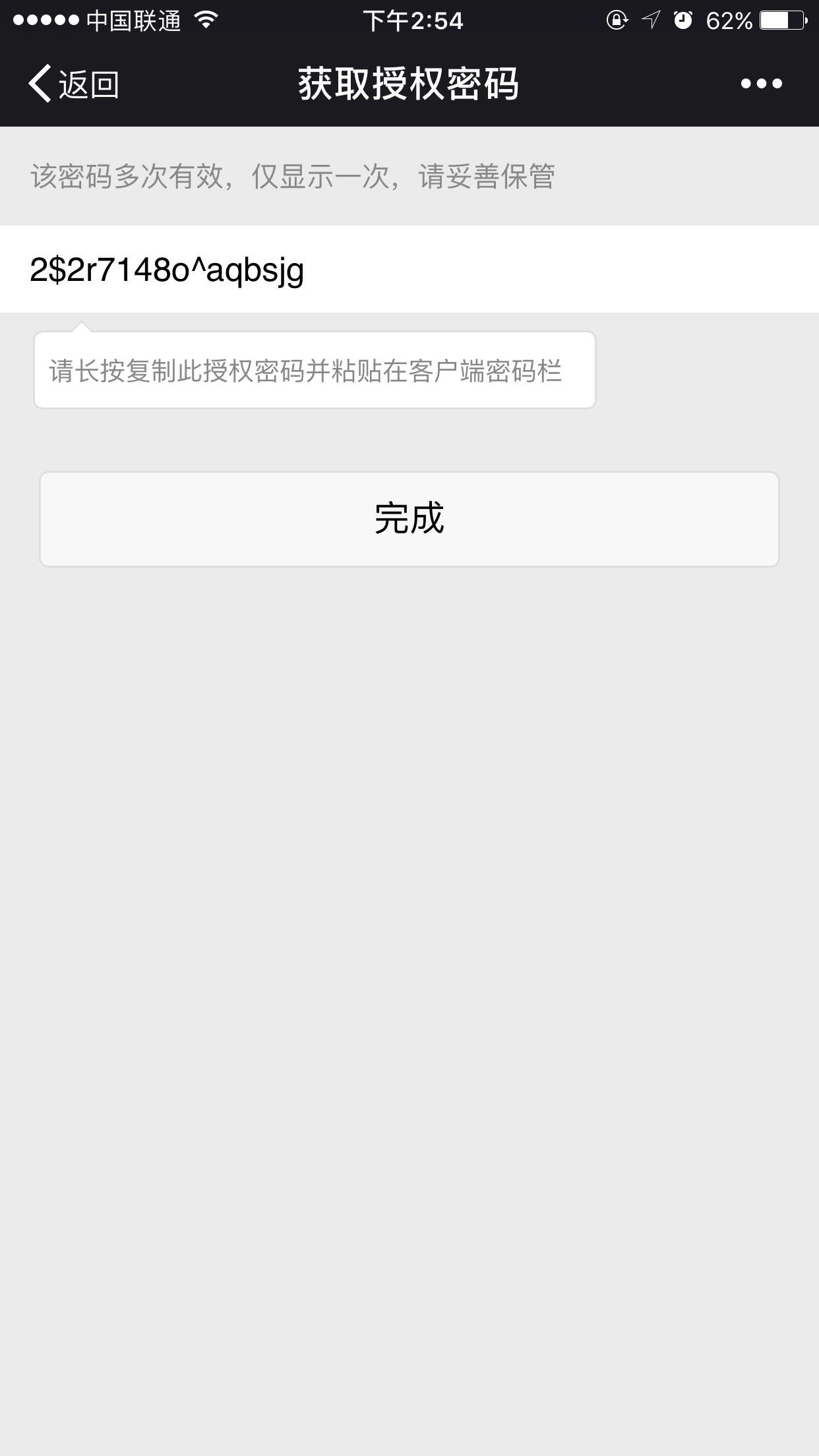 3.按提示点击获取授权密码,系统即返回授权密码如下图: