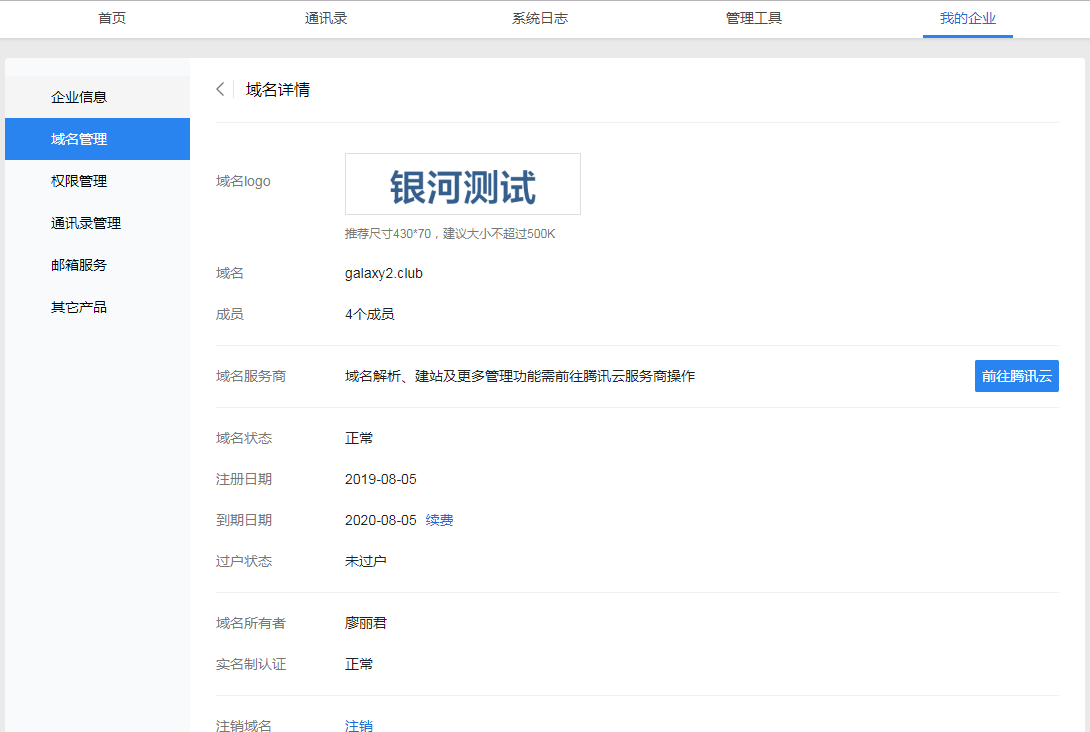 6、登录企业邮管理端-我的企业-域名管理,双击域名或点击域名查看详情,过户状态显示“已过户至腾讯云”