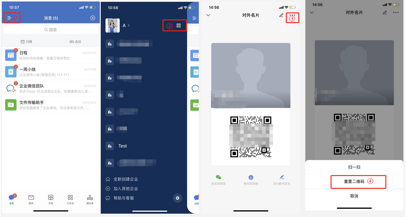 点击【右上角->三个点->重置二维码】可以进行重置名片二维码,不操作重置二维码,名片二维码不会过期。