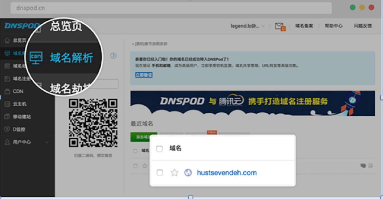 登录DNSPOD,进入【域名解析】,点击域名,或者下方提醒