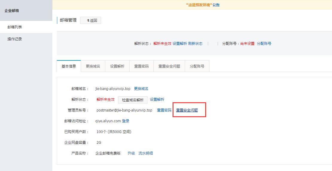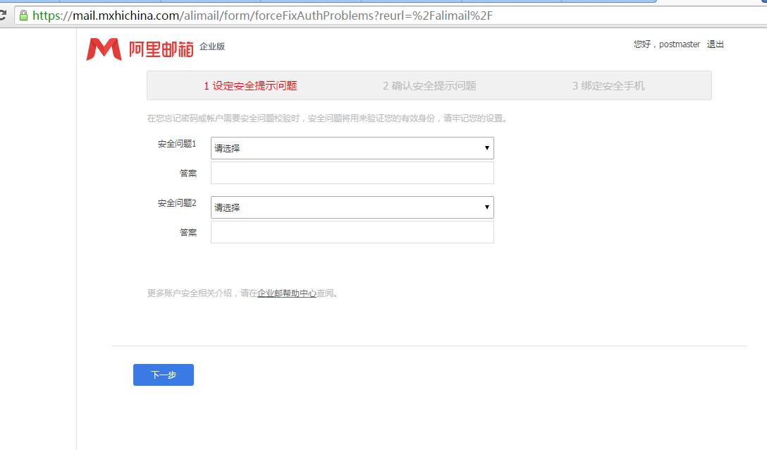目前管理员帐号postmaster已经全部开启二次验证,若你在登录时,遇到需要进行二次验证的,若绑定的安全问题答案已经忘记,建议亲登录 阿里云会员,到企业邮箱-管理-重置安全问题--通过阿里云会员绑定的安全手机验证-重置成功-重新登录postmaster帐号进行安全问题重新设置即可。
