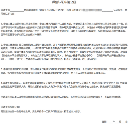 确认好微信公众号具有申请认证的资格之后,可以在公众号后台微信认证处下载微信认证申请公函模板。申请主体处填公司名称,名称必须和营业执照上一样,不能多字或者少字,后面横线处填写微信公众号。公函最下方空白处法人签名然后盖上公司公章就可以 上传等待审核。