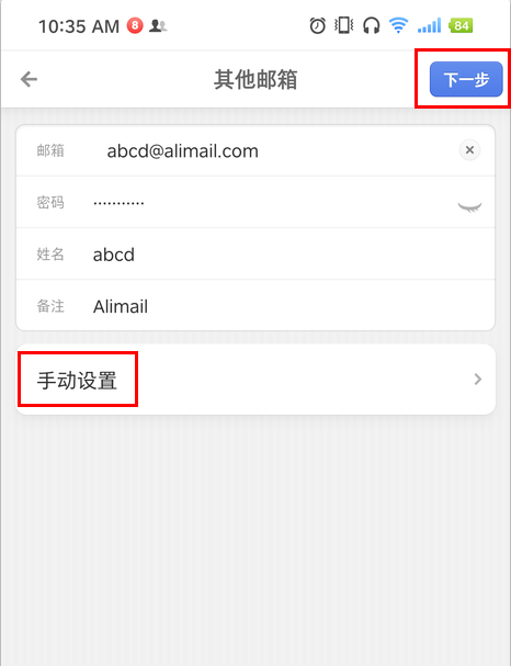 第二步:填写邮箱的email地址及邮箱密码,点击“下一步” 或 “手动设置”