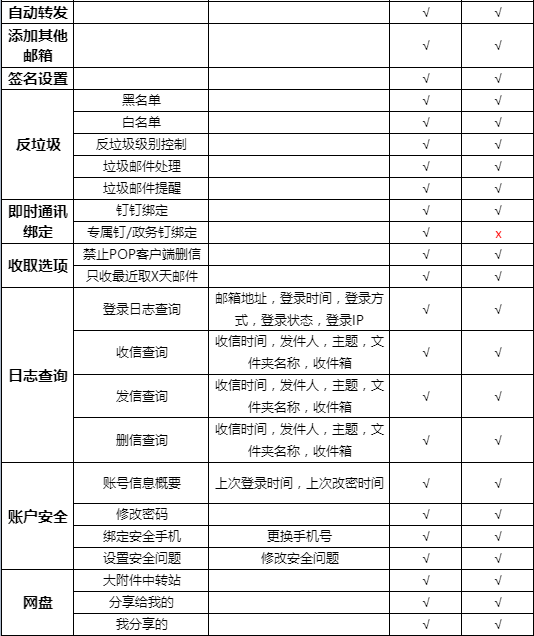 邮箱容量 | 5GB | 无限容量 | ||