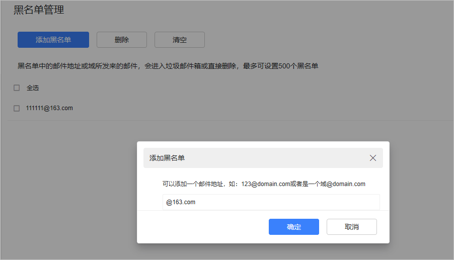 注意:黑名单添加邮箱域时,必须包含@,否则会判断该Email地址或域名格式不合法。
